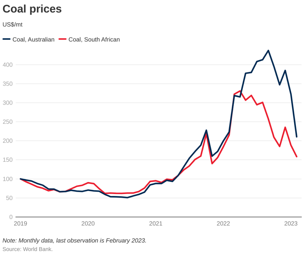 After reaching record highs, coal prices started dropping in late 2022. This decline is partly due to increased production and milder weather. For instance, benchmark prices in Australia and South Africa have fallen by half since their peaks in September and April, respectively. Previously, a gap existed between these benchmarks because of supply issues in Australia (caused by cyclones) and limited options for Asian buyers to switch from high-quality Australian coal to lower-grade alternatives. However, with increased production and improved weather conditions, this price gap has practically vanished.